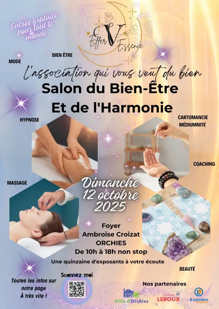 Le dimanche 12 octobre 2025, j’aurai le plaisir de participer au 1er salon du bien-être et de l’harmonie à Orchies, organisé par l’association EfferV’Essence.